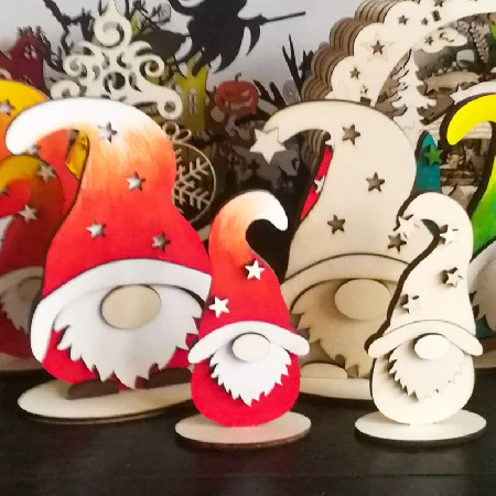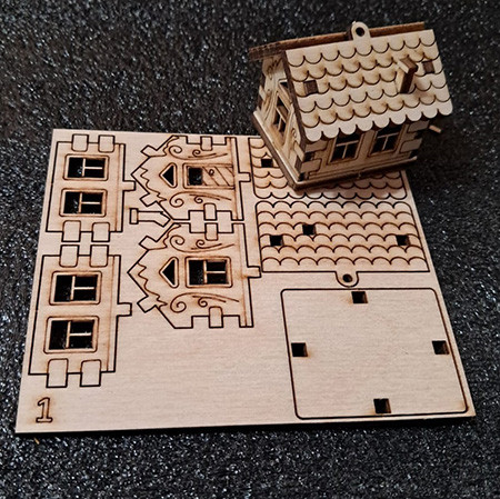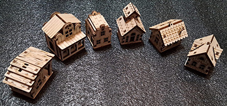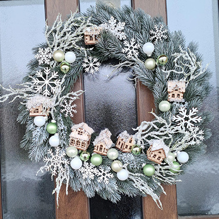 Laserem řezané domečky dodáváme v rozloženém stavu pro snadné vlastní sestavení. Věnec na fotce je ukázka jedné z možností použití – domečky se hodí i na svícny nebo do malé vánoční scénky.