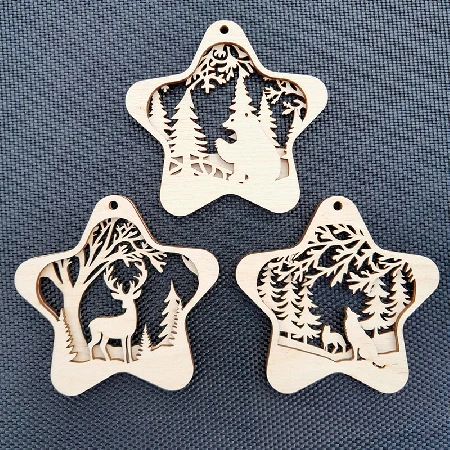Dárkové krabičky, hvězdy s lesním motivem, skřítci a svícny.