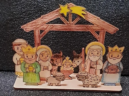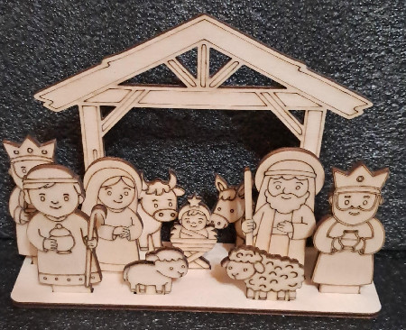 Kompletní betlém z naší dílny. Postavičky se zasouvají do podstavce – snadná montáž, možnost vybarvení.