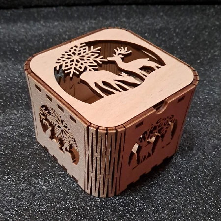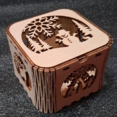 Krabička-svícen s motivem sněhuláka a vloček. Krásný světelný efekt.