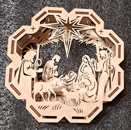 Malý betlém určený k postavení k svíčce nebo na svícen. Jemný gravír a přírodní vzhled.